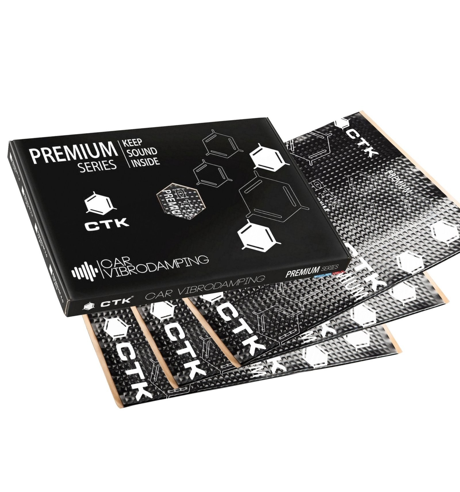Premium CTK este cel mai avansat material vibro-absorbant adeziv bazat pe noul cauciuc butilic compozit-polimer. Folia de aluminiu striata are o grosime de 100 microni (0,1 mm).Materialul ofera o eficienta ridicata de amortizare a vibratiilor, flexibilitate ridicata si o vascozitate foarte mare la substrat. CTK Premium este cel mai usor material vibro-absorbant fabricat in Europa.Usor de utilizat, noua formula super-lipicioasa Premium se muleaza perfect pe autoturisumul dumneavoastra.