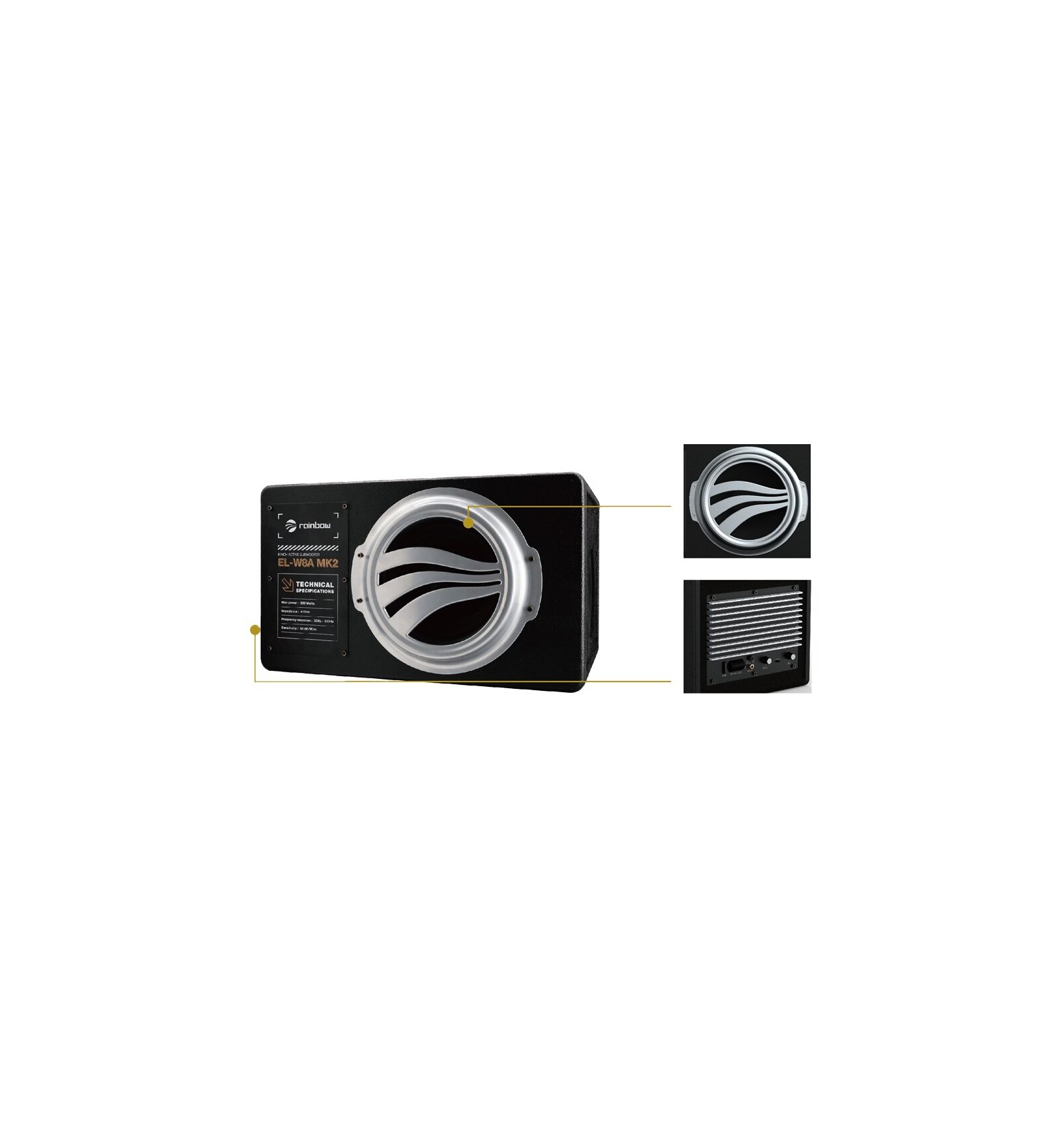 Rainbow EL-W8A MK2 este un subwoofer activ amplificat, conceput pentru a oferi un bas puternic și o prezență solidă a frecvențelor joase în mașină, fără a ocupa spațiu valoros. Cu un diametru de 8 inch (20 cm) și un design Slim (Ultra-subțire), acesta este ideal pentru montajul discret sub scaunul șoferului sau al pasagerului.